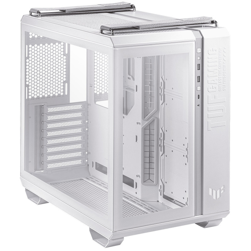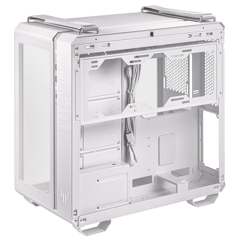 Le TUF Gaming GT502 configure des zones de refroidissement indépendantes pour le CPU et le GPU. Les panneaux en verre trempé offrent une vue teintée délicate qui met en valeur votre configuration. Le panneau avant comporte un port USB 3.1 Type-C mûr pour des vitesses de transfert allant jusqu'à 10 Gb/s. Les panneaux latéraux peuvent être retirés en appuyant simplement sur un bouton dissimulé à l'arrière du châssis. Deux sangles durables et détachables, pouvant supporter jusqu'à 30 kg, facilitent le déplacement du châssis, même lorsqu'il est chargé de matériel.