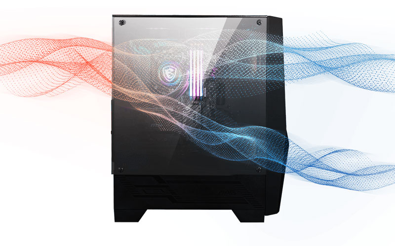 Au-delà de ses bonnes performances, ce boîtier propose un look moderne et agressif, renforcé par le système d'éclairage RGB sur les ventilateurs en façade. En effet, ce système est capable de créer de splendides effets lumineux, que vous pouvez même synchroniser avec vos autres produits compatibles MSI Mystic Light afin d'aboutir à un résultat homogène. Le panneau latéral en verre trempé de 4 mm allie de son côté style et robustesse pour mettre en avant le rétroéclairage que vous aurez choisi.