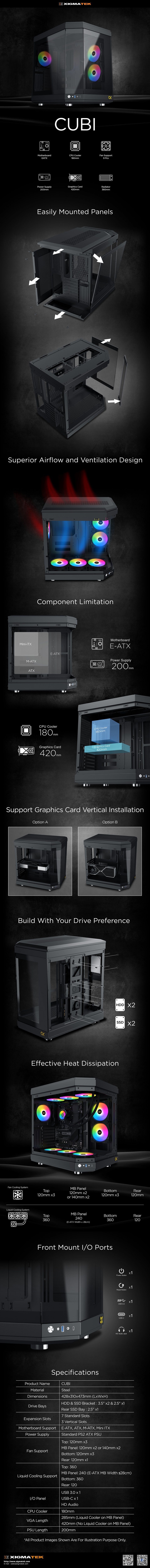 Moyen tour - E-ATX - ATX - MATX - MITX - USB 3.0 - Emplacements 2,5" : 4 - Emplacements pour ventilateurs additionnels : 7 - 3 ventilateurs inclus - Verre Trempe - RGB - Sans Alim - Noir