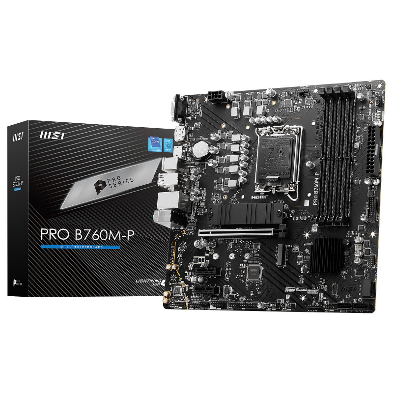 La carte mère MSI PRO B760M-P DDR5 conçue pour les processeurs Intel Core hybrides de 12ème et 13ème génération est idéale pour l'assemblage d'une configuration puissante au coût maitrisé. Elle prend en charge les processeurs Intel Core 12ème et 13ème génération, les cartes graphiques PCI-Express 4.0 16x, les SSD M.2 PCIe 4.0, la RAM DDR5 ainsi que les périphériques USB 3.1.