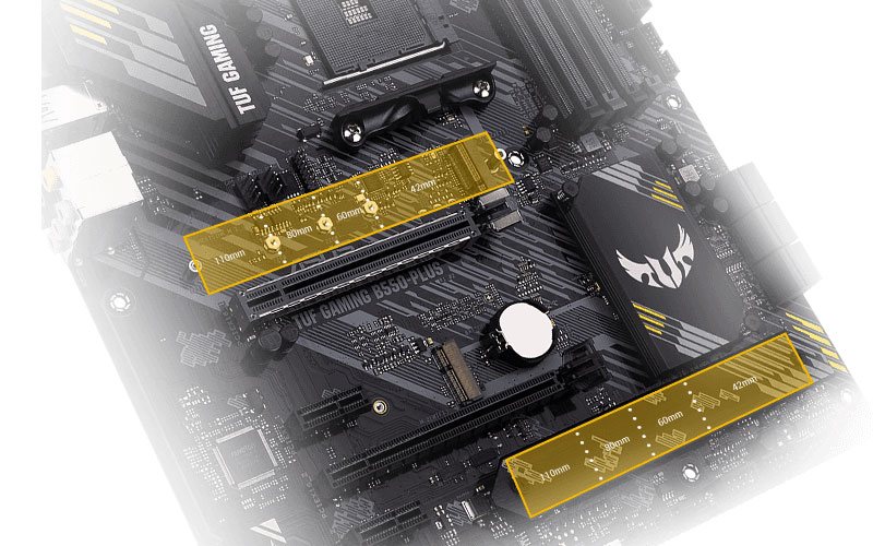 Avec deux slots M.2 PCIe dont un à la norme 4.0, la carte mère TUF GAMING B550-PLUS d'ASUS prend en charge jusqu'à deux SSD NVMe pour booster les performances de votre PC Gaming. Vous profitez des vitesses de transfert de données les plus rapides sur la plateforme AMD Ryzen de 3ème génération.