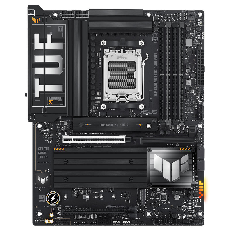 L’ASUS TUF GAMING X870-PLUS WIFI est une carte mère gaming au format ATX conçue pour les processeurs AMD Ryzen 7000, 8000 et 9000. Elle se dote de composants de qualité militaire, d’une solution d’alimentation améliorée avec 16+2+1 phases de puissance ainsi que d’un système de refroidissement complet, avec des dissipateurs surdimensionnés, pour garantir des performances constantes lors de vos sessions de jeu. Elle dispose de 16+2+1 étages de puissance, de quatre emplacements M.2, de la prise en charge de la mémoire DDR5 et de la connectivité PCIe 5.0.