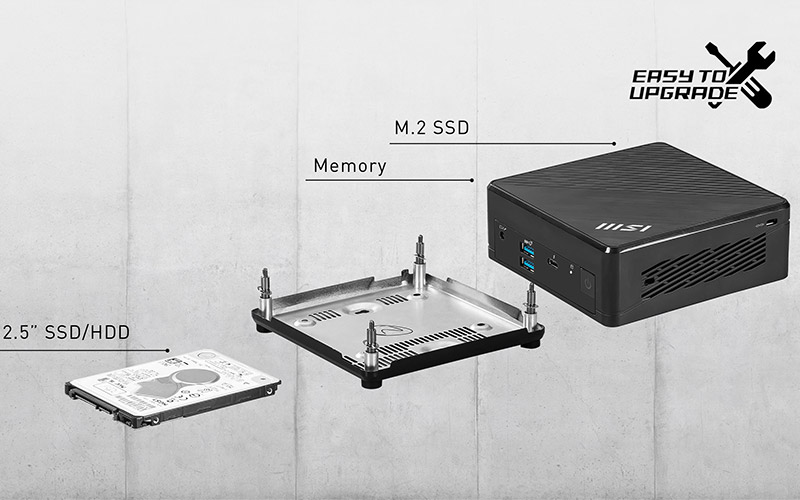 Si vous voulez mettre à niveau les performances de votre mini-PC, vous pourrez facilement accéder au slot SSD M.2, au slot HDD/SSD 2,5'' et aux deux slots mémoire SO-DIMM en détachant la partie latérale. Grâce à cette caractéristique, vous pouvez rendre votre Cubi 5 12M plus flexible et personnaliser votre utilisation comme vous l'entendez.